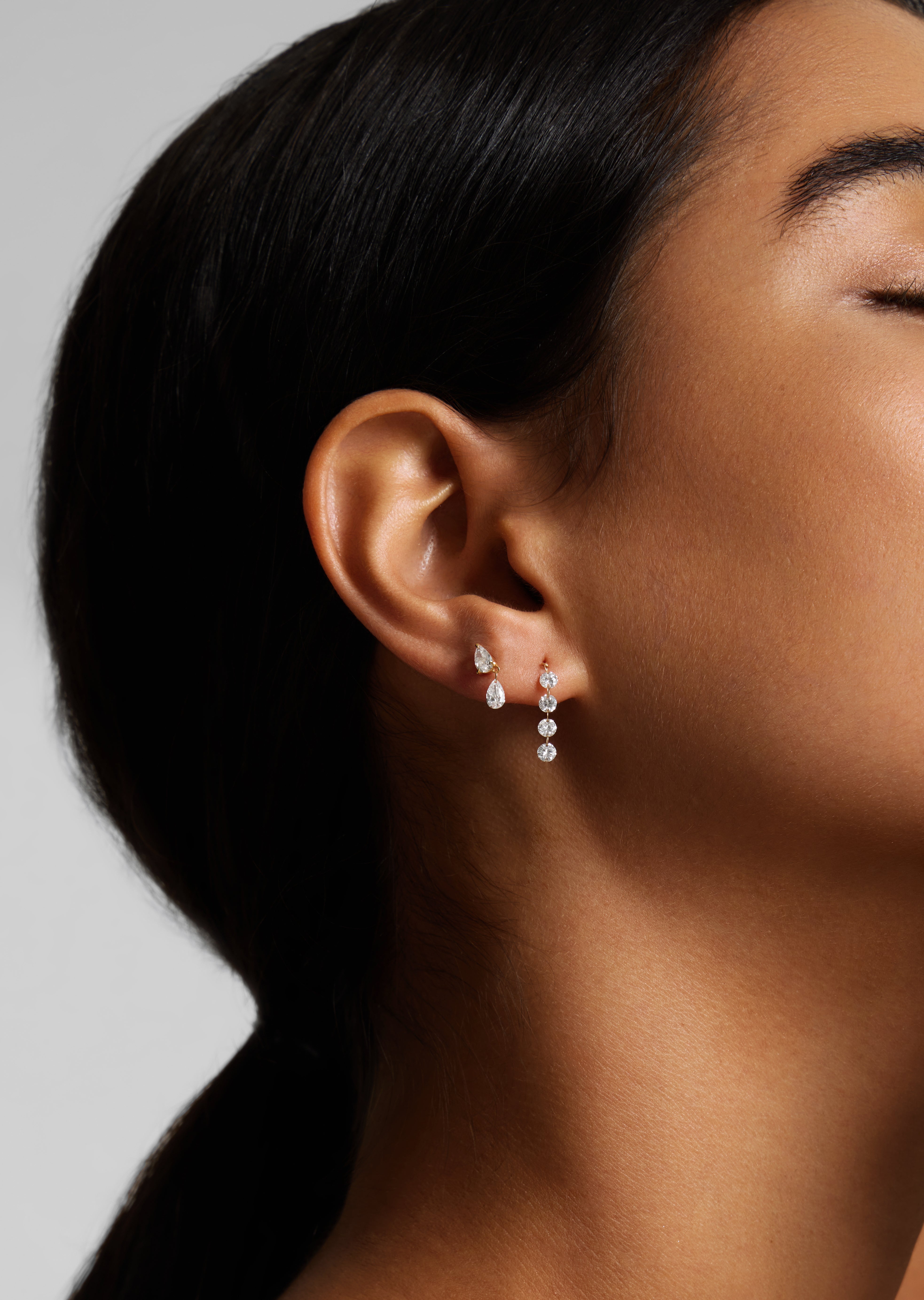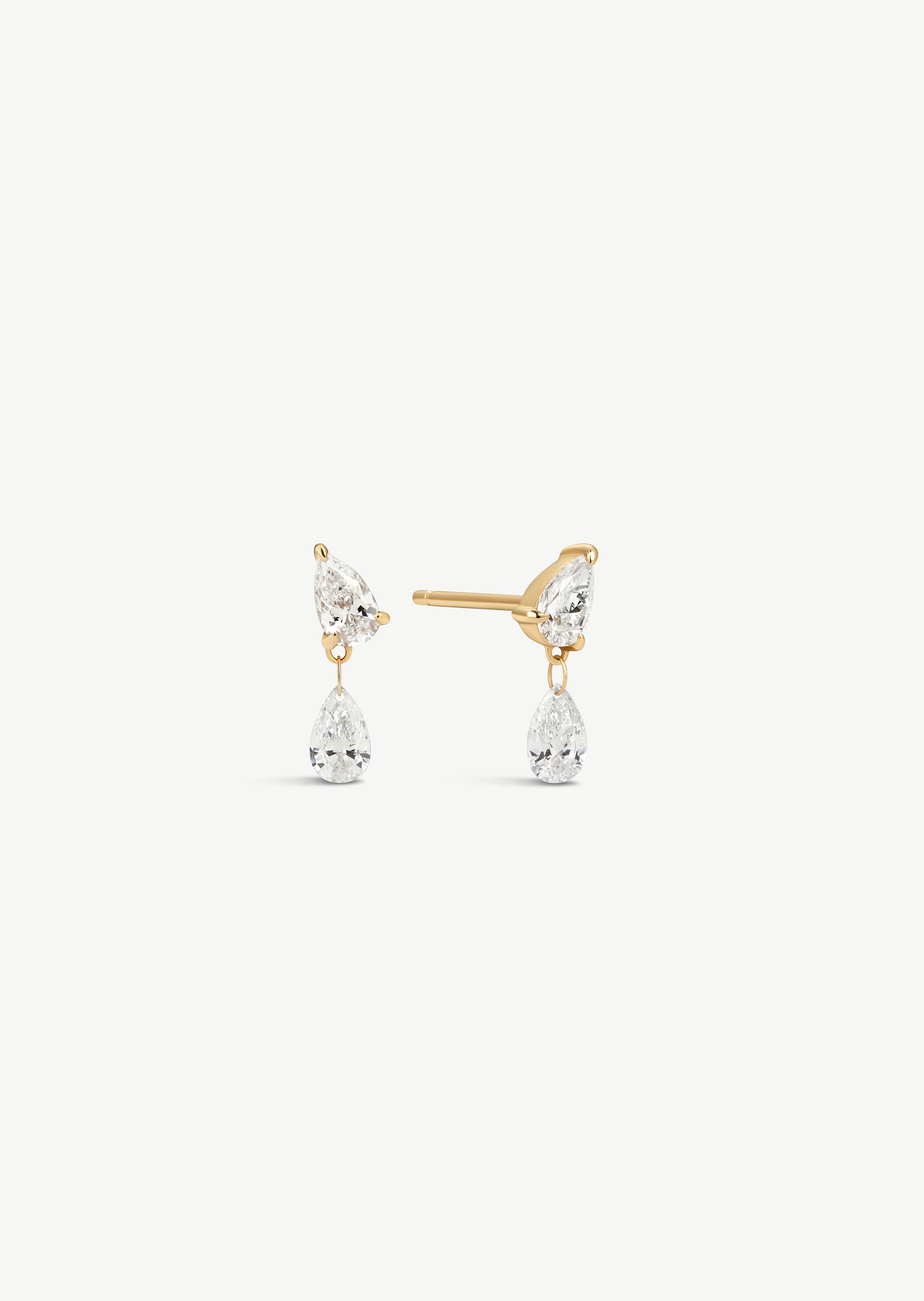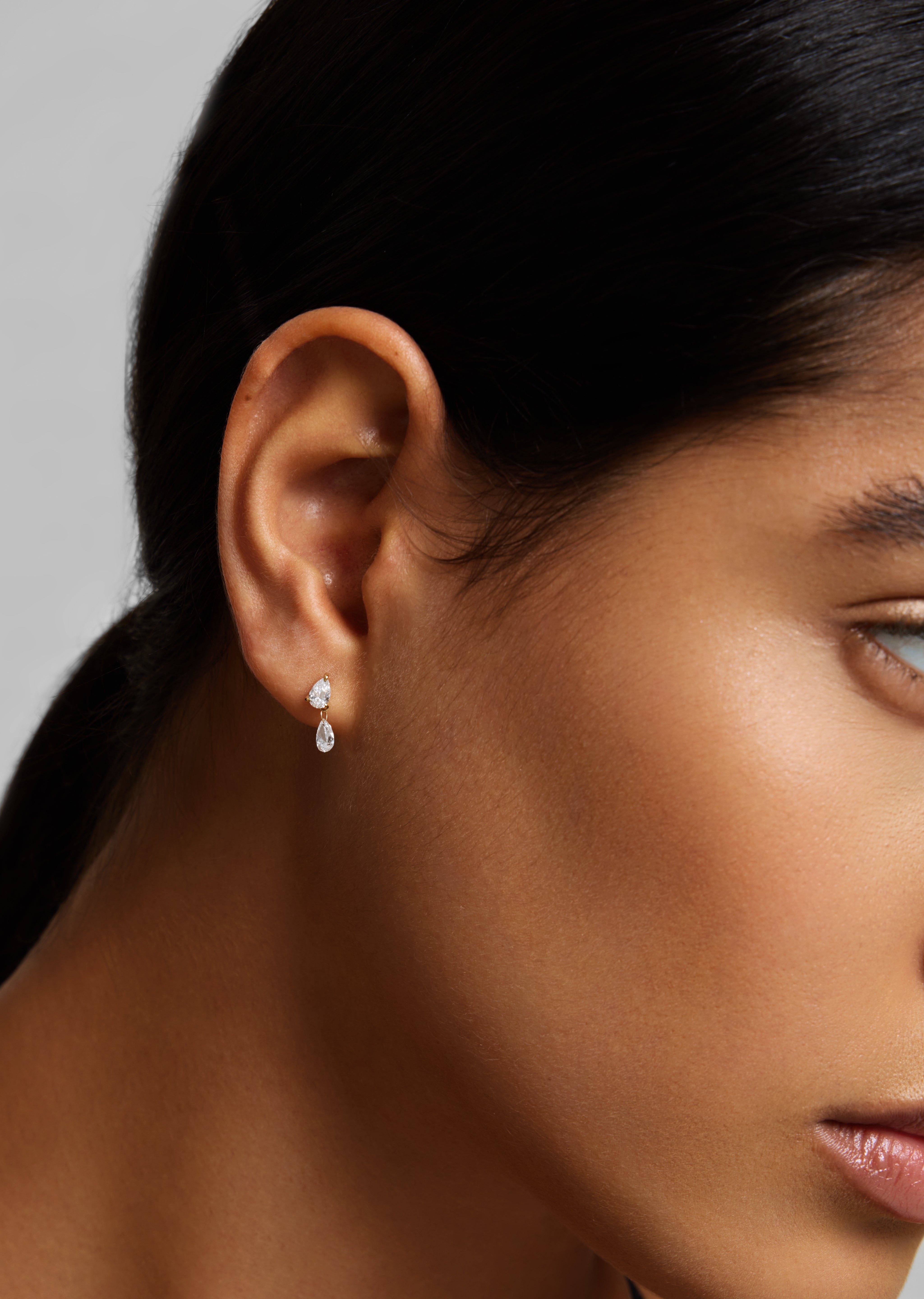 A play on symmetry and movement — two pear-cut diamonds suspended in perfect balance. Understated yet expressive, they catch the light with every turn — taking your everyday studs up a notch.