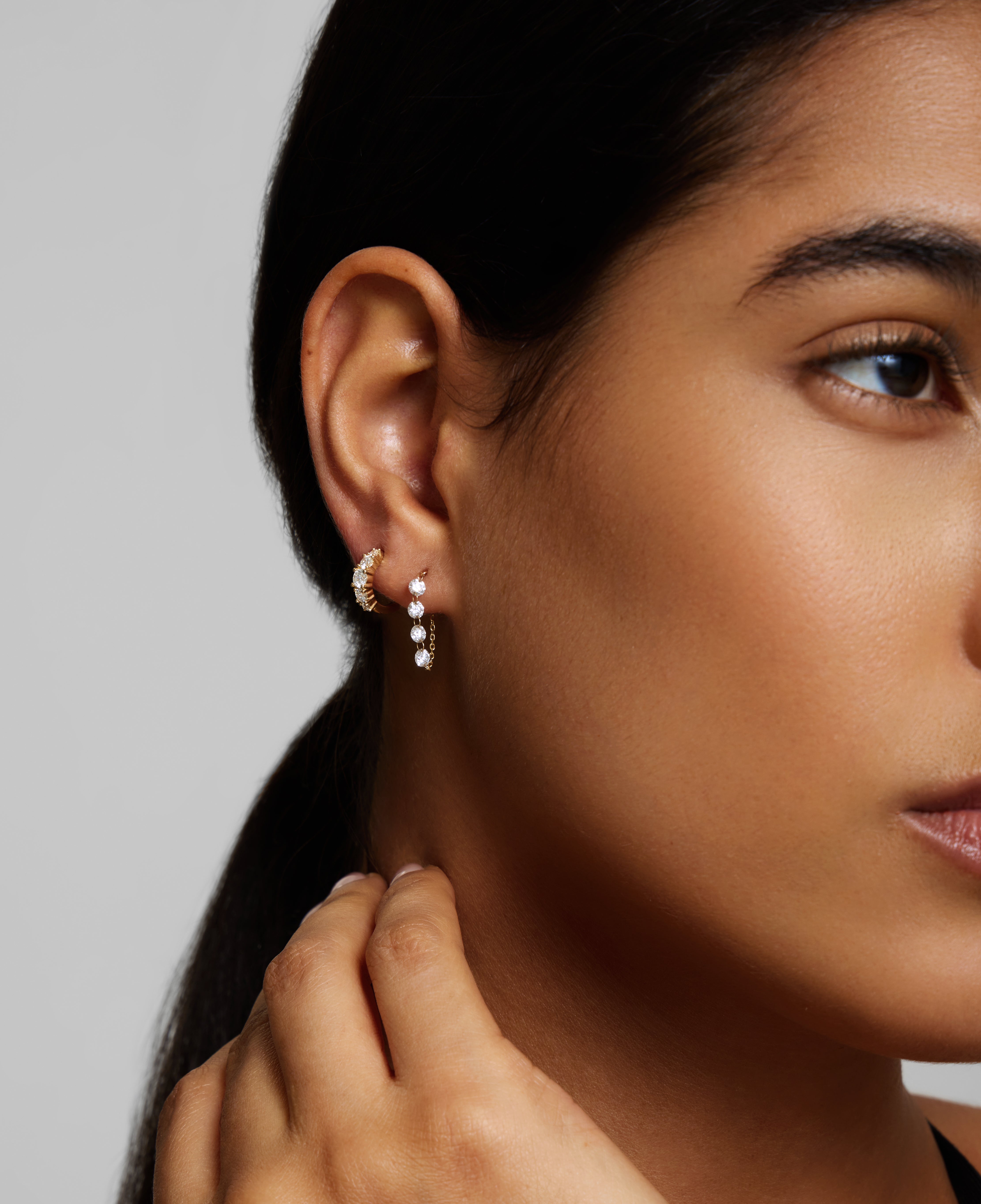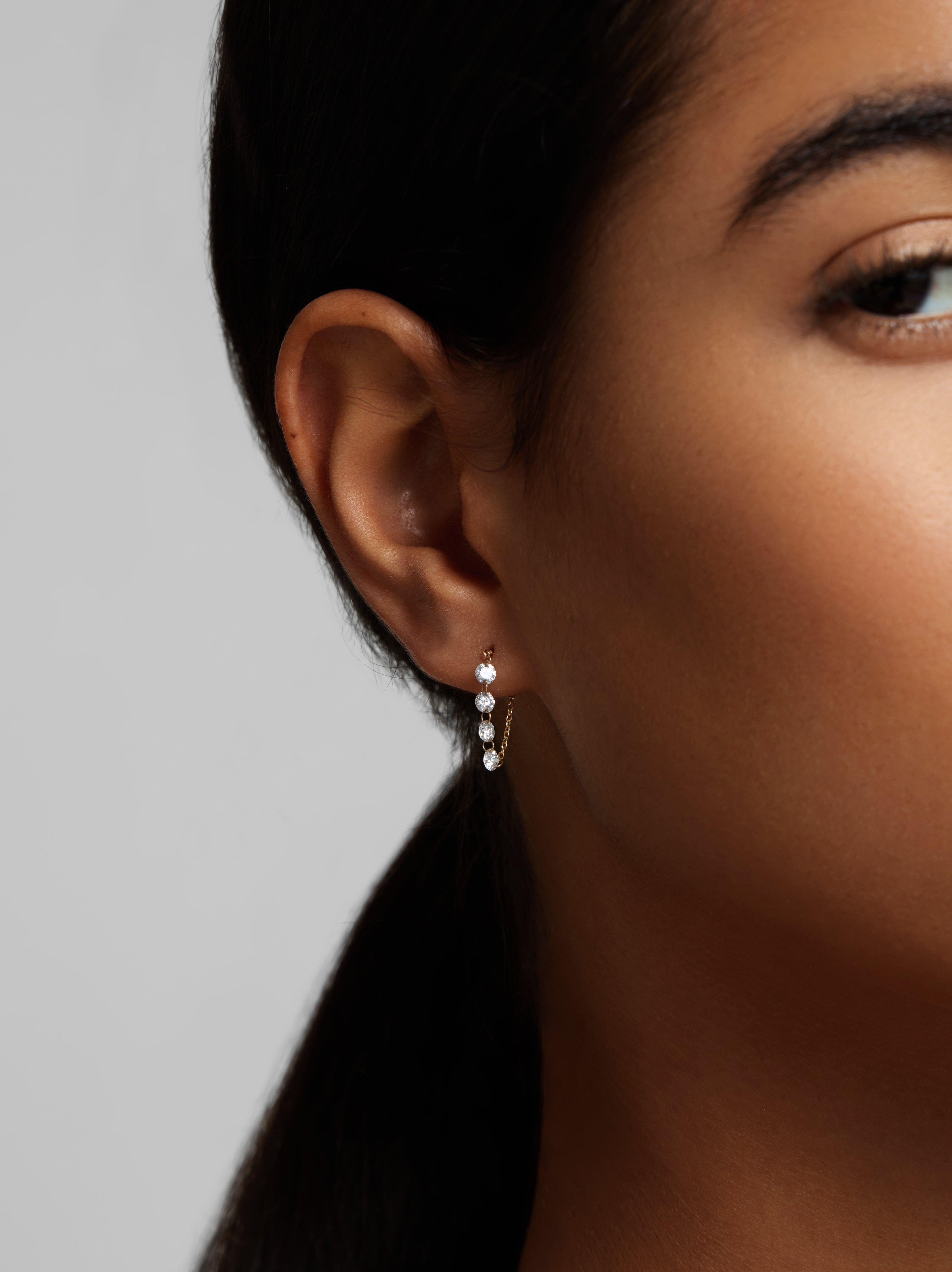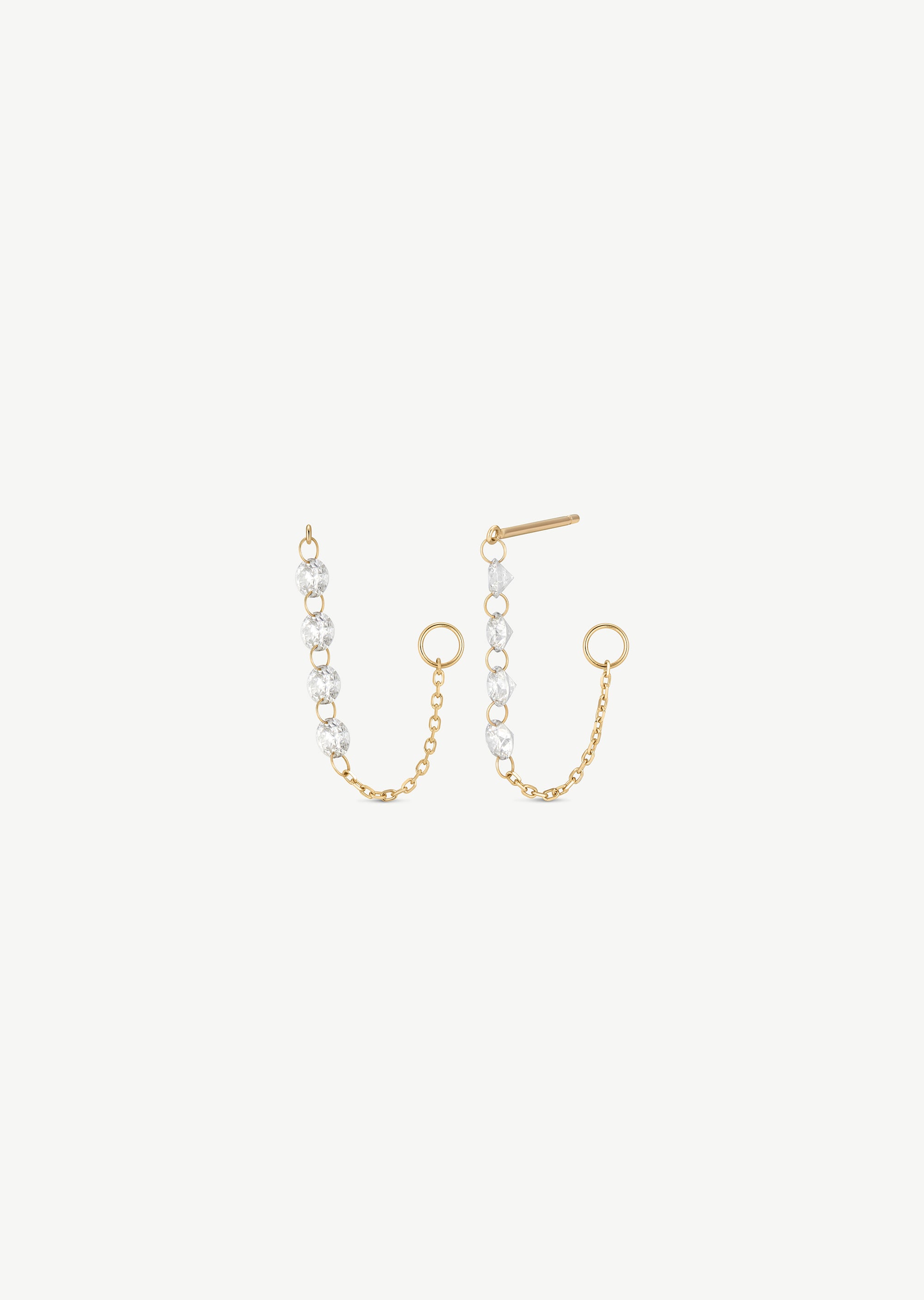 A fine chain of diamonds designed to move with you. Lightly suspended for subtle motion, these earrings catch the light with every turn — effortless, expressive, and quietly striking.